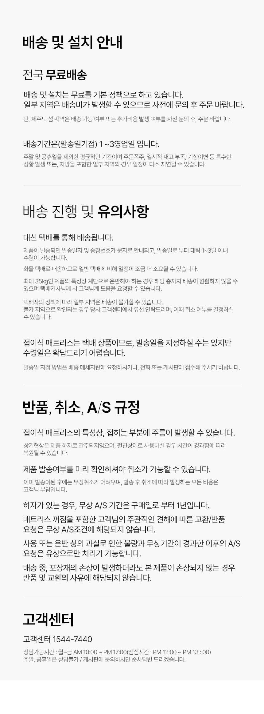 | 품질보증기준 | 품질보증 무상A/S 1년 / 주문제작 및 설치상품으로 배송 전 배송 약속 안내 후에는 취소/교환/반품 불가능 제작상품은 재판매가 불가능하므로 설치완료 후에는 교환/반품 불가능 파손 및 제품 이동에 의해 발생된 문제는 실비청구(비용은 상세이미지 참조) | ||