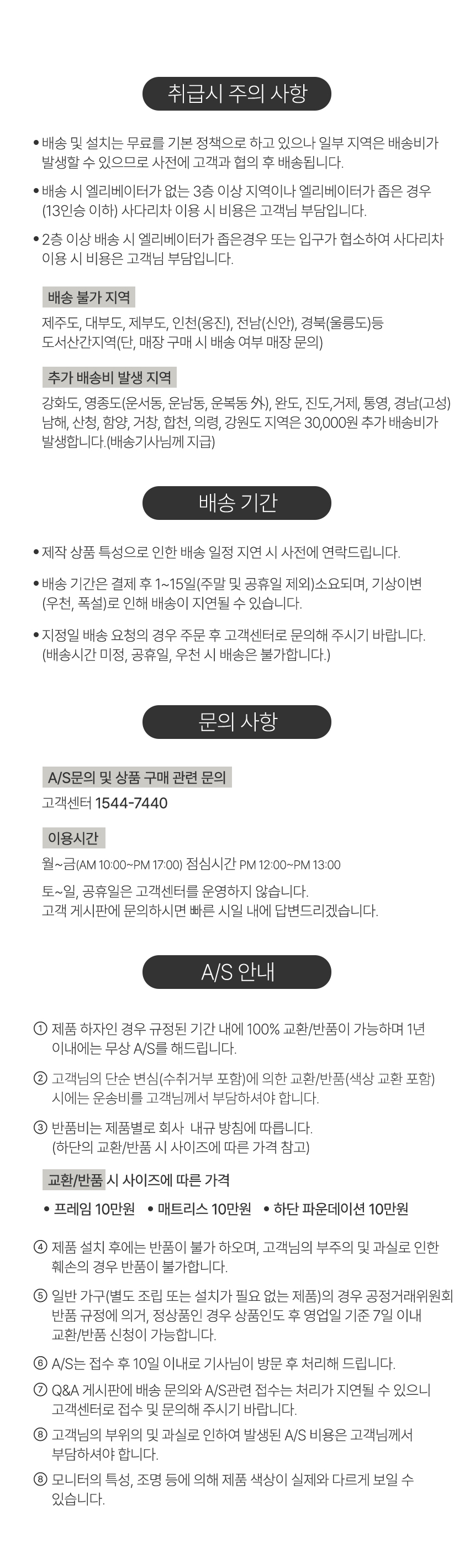 | 품질보증기준 | 품질보증 무상A/S 1년 / 주문제작 및 설치상품으로 배송 전 배송 약속 안내 후에는 취소/교환/반품 불가능 제작상품은 재판매가 불가능하므로 설치완료 후에는 교환/반품 불가능 파손 및 제품 이동에 의해 발생된 문제는 실비청구(비용은 상세이미지 참조) | ||